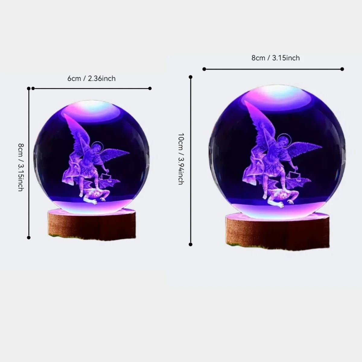 Exquisite 3D Laser Engraving Using advanced laser technology, the powerful scene of St. Michael defeating the demon is meticulously etched inside a solid crystal sphere. The 3D detail is incredibly precise, giving the statue a lifelike quality that can be appreciated from every angle. When illuminated, the engraving glows with a vibrant, ethereal light, creating a truly mesmerizing visual effect.