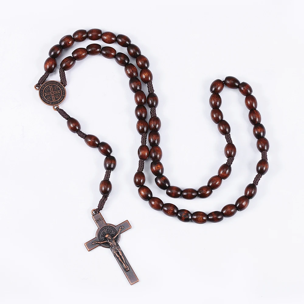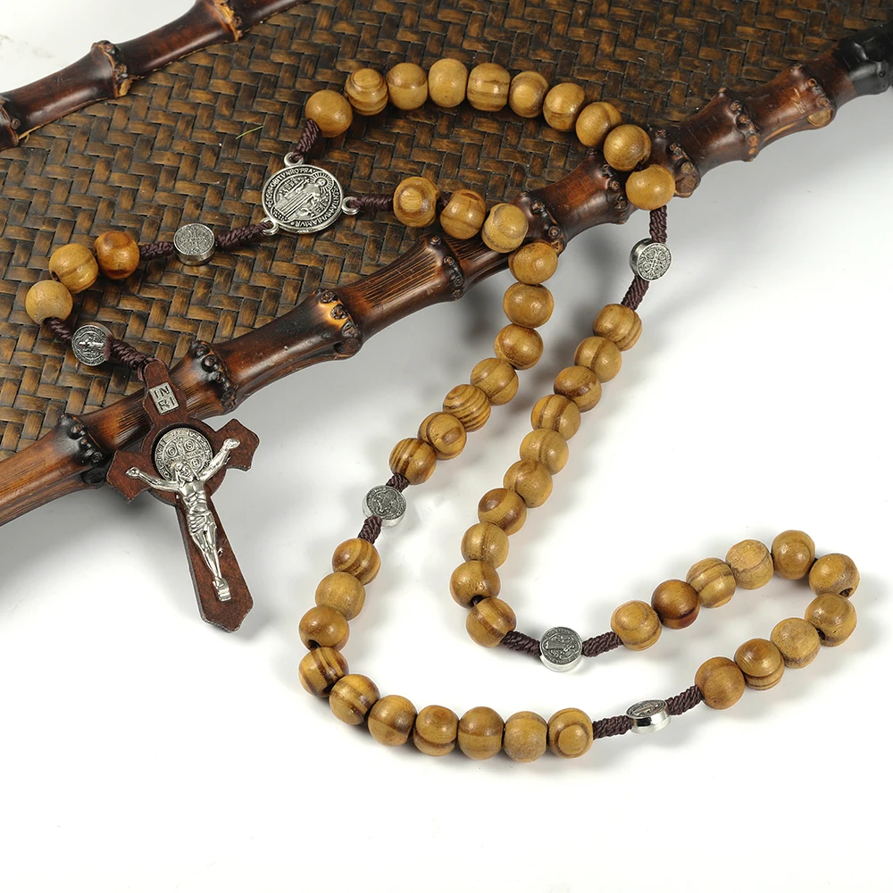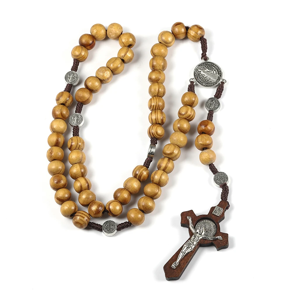 Symbolic and Meaningful Design The centerpiece of this necklace is the detailed wood cross pendant, which is adorned with a classic depiction of Jesus. This powerful symbol of faith and hope is complemented by a medallion, often featuring St. Benedict, which is known for its protective qualities. This combination of elements makes the rosary a personal and meaningful item.