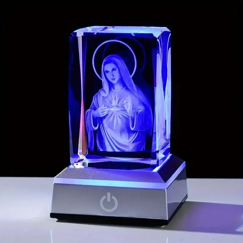 Illuminate your space with faith and beauty with this crystal Virgin Mary statue. The image of Our Lady is laser-engraved inside a solid crystal block, creating a stunning 3D effect. The adjustable LED base allows you to control the lighting with a simple touch, enhancing the figure's beauty. It's perfect for decorating a nightstand or any tabletop, offering a touch of peace and inspiration. It's an ideal gift for various occasions, such as Christmas, Easter, Birthdays, or for your mother. The statue is powered by a USB cable, ensuring convenience and durability.